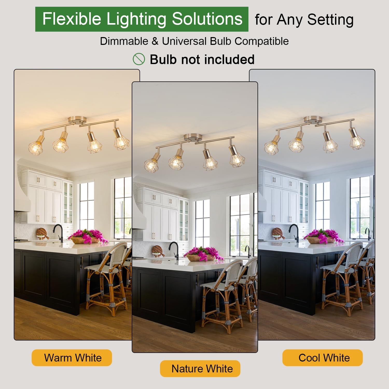 • 【Standard E26 Sockets & Bulb Requirements】The light fixtures ceiling mount is compatible with E26 based bulbs, including LED, CFL, incandescent and halogen bulbs. It is also fully dimmable when used with a dimmable bulb and dimmer switch. You can choose energy-efficient options for optimal lighting, or select dimmable or smart bulbs to create the perfect ambiance (bulbs not included; max 60W per light)