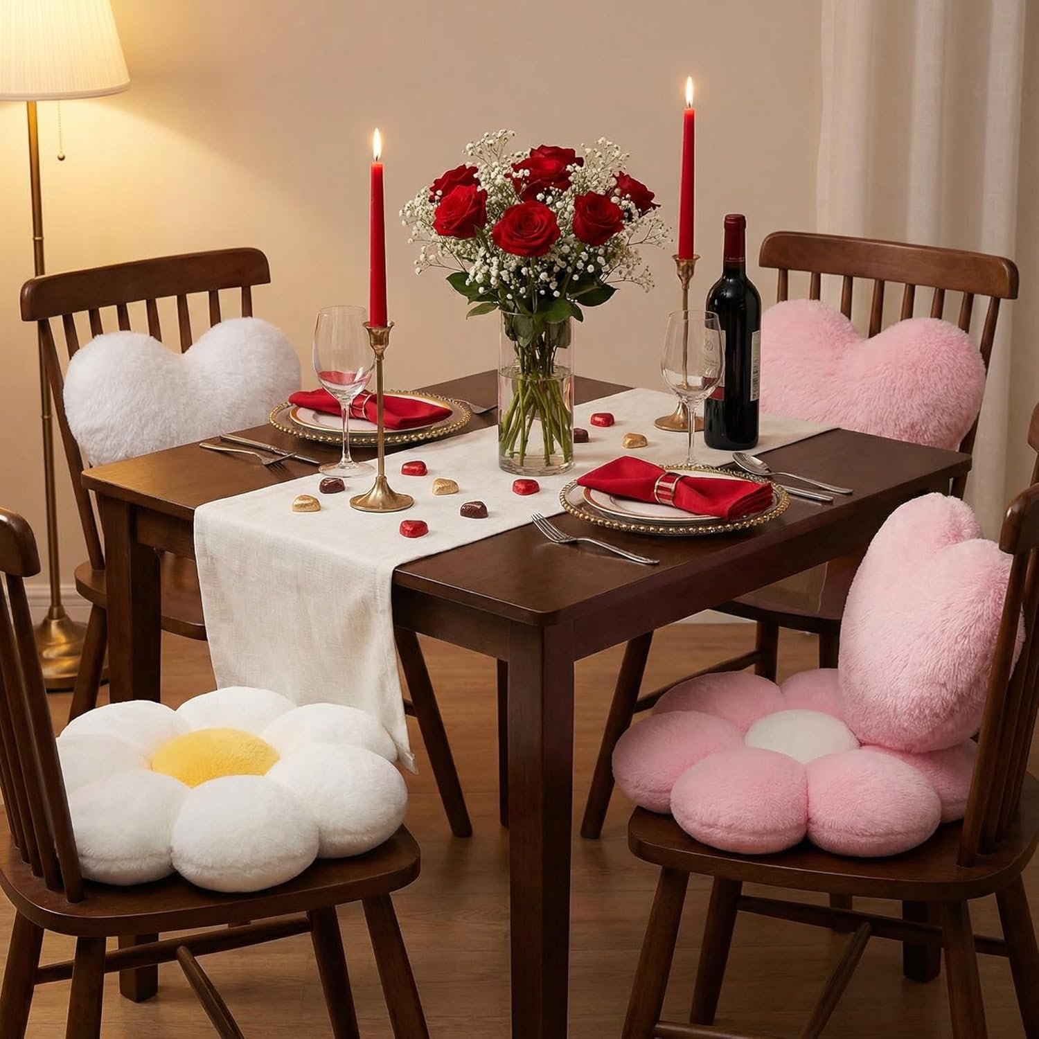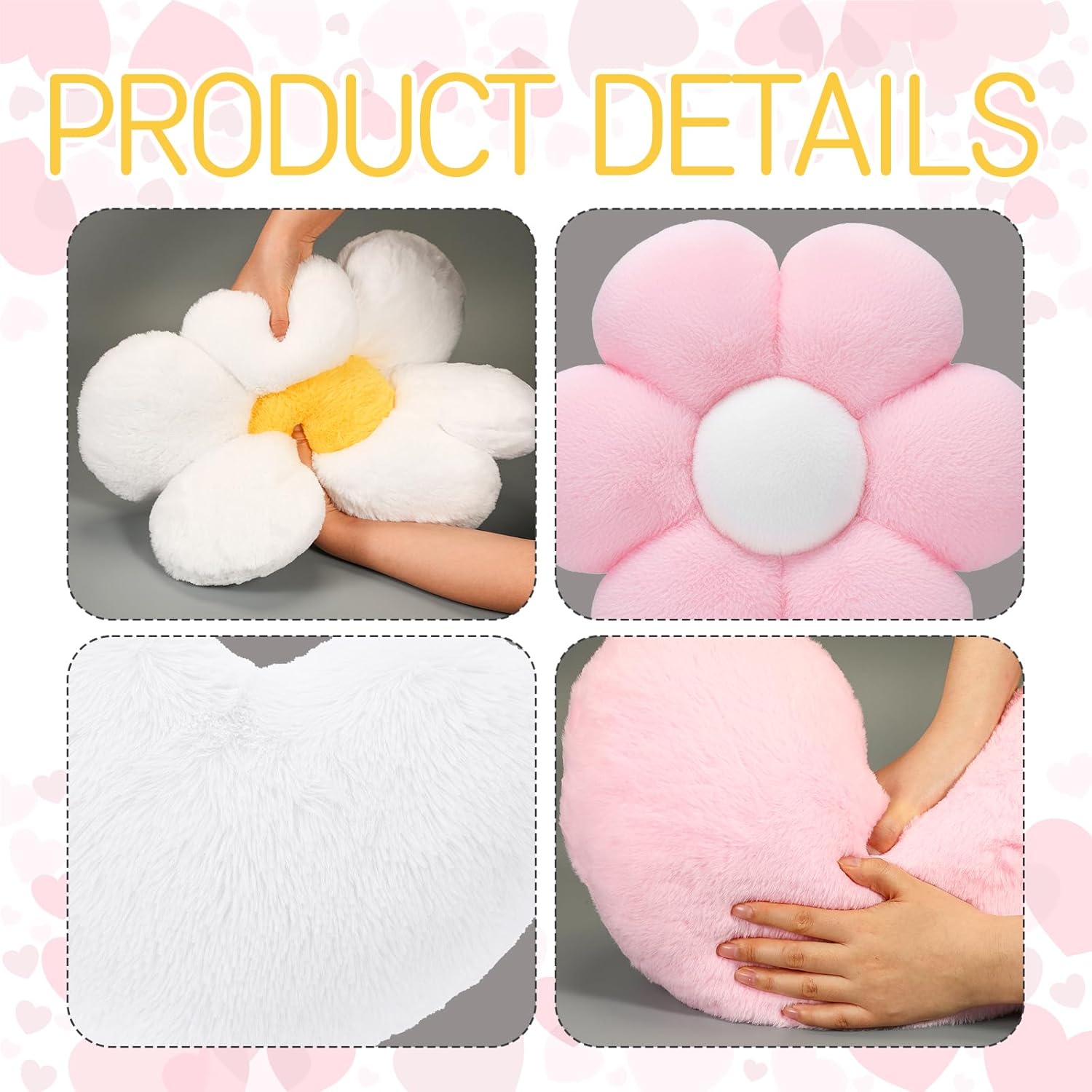 Features: The daisy pillow has a three-dimensional design, each petal is full and plump, with strong support and comfortable sitting, and the fabric is skin-friendly, delicate and soft When you receive these decorative plush pillows, it will be in a compressed vacuum pack, open it, wait about ten minutes, pat it into a daisy or heart shape, hope you like this surprise. Specifications: Material: cotton Color: light color Size: Daisy throw pillow: about 17.72 x 17.72 inch Heart shape pillow: about 17.72 x 14.17 inch Package includes: 2 x Daisy throw pillow 2 x Heart shape pillow Notes: Manual measurement, please allow slight errors on size. The color may exist a slight difference due to different screen displays