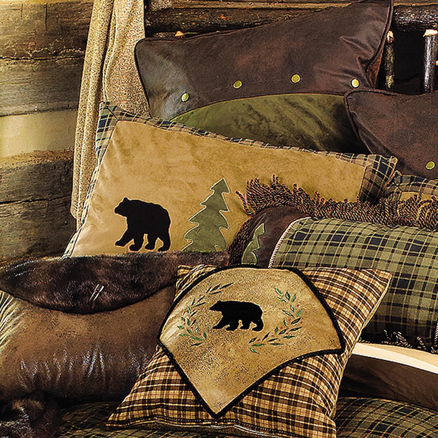 Turn your bedroom into a rustic retreat with the Black Forest Décor Alpine Bear Bed Set - King. Featuring elegant bear and pine tree appliques, plaid patterns in olive green, faded blue, and chocolate brown, as well as antique gold rivet detailing, this bedding set embodies woodland charm. The set includes an oversized 110"W x 96"L comforter for king mattresses, a 76"W x 80"L x 15"H bedskirt, two king-size 20"W x 36"L shams, and one decorative 26"W x 14"L accent pillow. Made from high-quality microsuede fabric, it offers warmth, softness, and durability. Dry clean for best results, and elevate your cabin, lodge, or rustic-style bedroom with this versatile and sophisticated bed set.