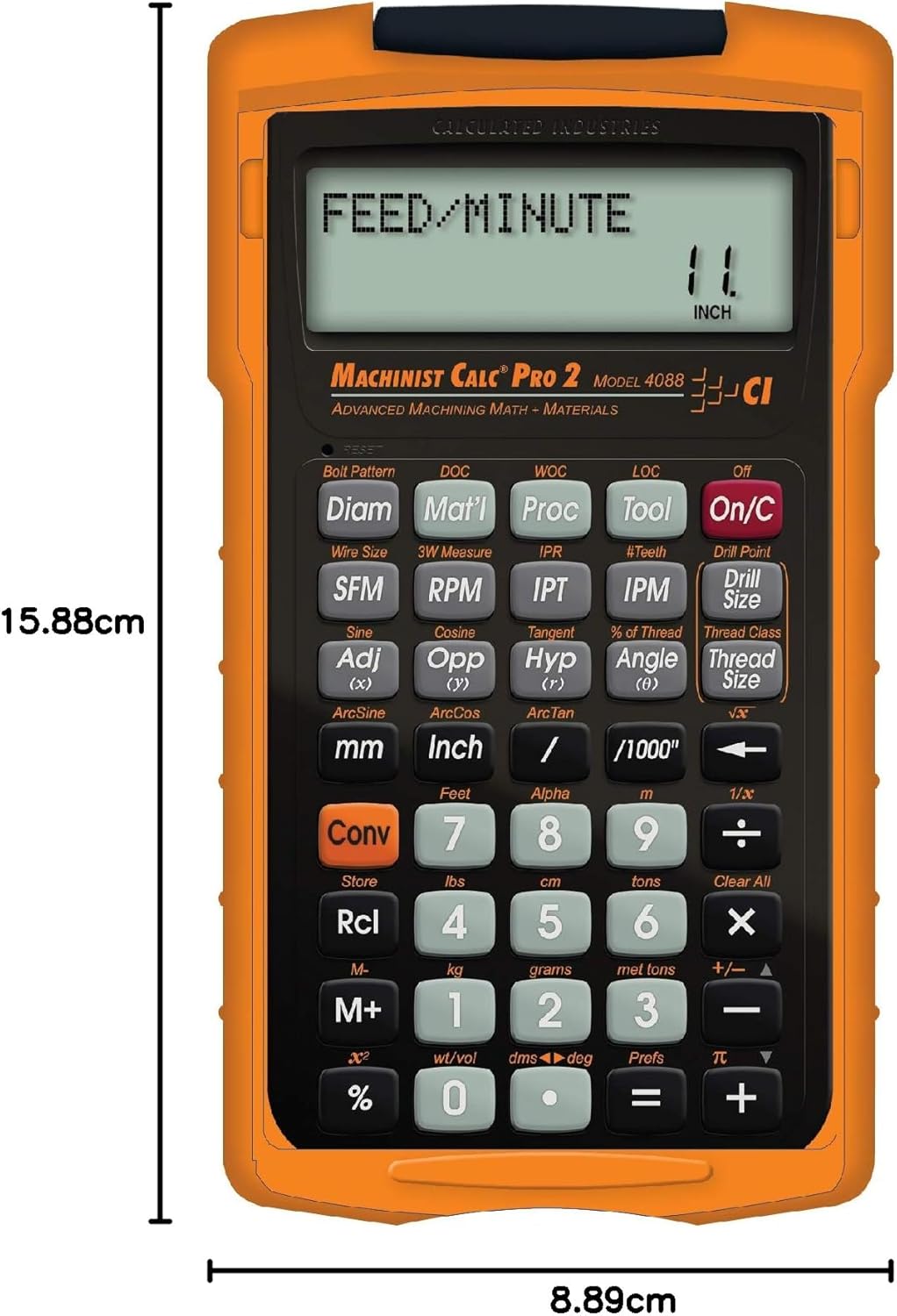 Reduce wear and tear on costly cutting tools with the Machinist Calc Pro 2. ≡≡ This advanced machining math calculator includes materials and tool settings combined with DOC and WOC to solve all your speed and feed calculations for face, end or slot milling plus turning, drilling and boring. ≡≡ It has built-in tables for 20 materials, six processes and three tools (High Speed Steel, Carbide and High Performance). ≡≡ It also gives you step-saving drill and thread chart look-ups, right triangle solutions, bolt-circle patterns with center x, y coordinates; Drill Point Cut Depth solutions, wire sizes and 3-wire measurements, a larger 2-line LCD display and much more all built into a portable, rugged and cost-effective handheld calculator. ≡≡ Built-in functions include calculations for feeds and speeds (including cutting speed, spindle speed, cutting feed, feed per tooth/chip load, and more); and trigonometric functions. ≡≡ Additionally, you can enter numeric, fractional, and metric thread sizes and drill sizes to display tap, roll tap, close and free fit drill sizes plus pitch, and major and minor diameters. ≡≡ The Machinist Calc Pro 2 is built for efficiency-minded machinists, setters, tool-and-die makers, supervisors and shop owners in small to mid-sized machine shops who want to increase shop productivity and profits in the design, layout and set-up stages of production. ≡≡ The MCP 2 is a dedicated handheld machining math and reference tool that provides a complete assortment of essential machine shop solutions and time-saving tap and drill charts that can dramatically increase users' calculating power, eliminating wasted steps and saving time. ≡≡ It also works as a standard math calculator, converts between U. S. and Metric Units, Feet-inch-fractions to 1/64ths, decimal inches and mils, meters, centimeters, millimeters, pounds, tons, grams, kilograms and metric tons, area, volume and weight. Enter Wire Size (or use calculated Best Wire size) and 3-Wire Measurement to calculate pitch diameter. Button-Cell Battery Safety Compliant Design -- This product uses a button-cell battery housed in a compartment secured with a tool-required fastener. The battery is not accessible during normal use without a tool, supporting alignment with applicable U.S. consumer product safety requirements for button-cell batteries.