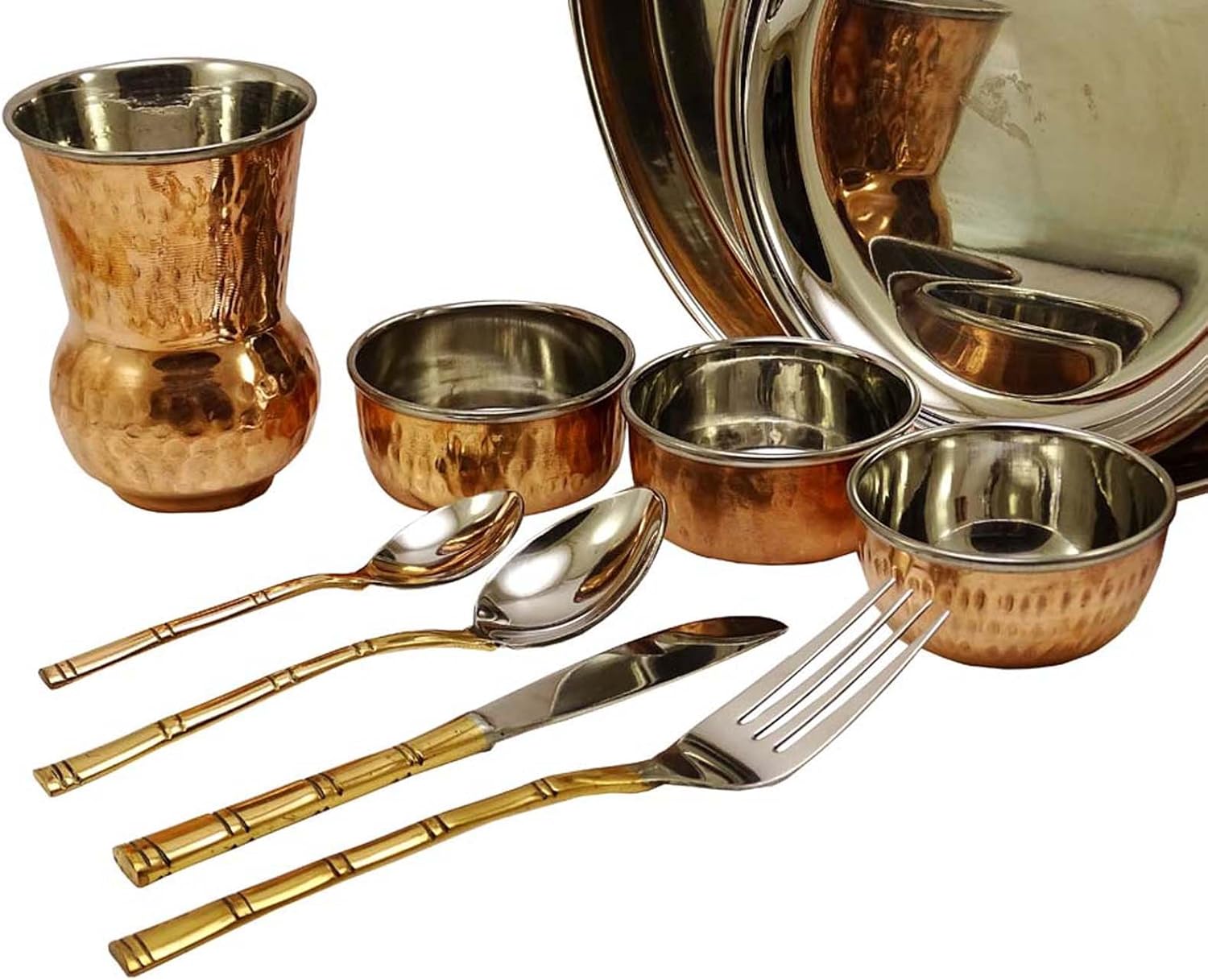 * Indian Stylish Traditional, Copper- Steel Dinner Set of 10 pcs.* Serving food in Maharaja Style set in copper Steel matarial. * Brand New Unused product. * Dinner Set contains Thali, 1 Small Plate, 3 Bowls, 1 Glass, 4 Spoon. * Size (In Inches): * Thali: 1 X 12” (D) Inches. * Small Plate: 8” (D) Inches. * Glass: 4.5 X 3.2 (D) Inches. * 2 Big Bowl : 1.3" X 3 (D) Inche. * Small Bowl 1.5" X 3.2" (D) inches. * Fork: 8.5” X 1” Inches. * Butter Spoon: 7.3" X 0.9” inches. * Big Spoon: 7” X 1.5” Inches. * Small Spoon: 5.5” X 1” Inches. * The fusion of Copper & Steel is so seamless that it is hardly visible from where they originate. * Beautiful Antique Item to use or to gift your loved ones.