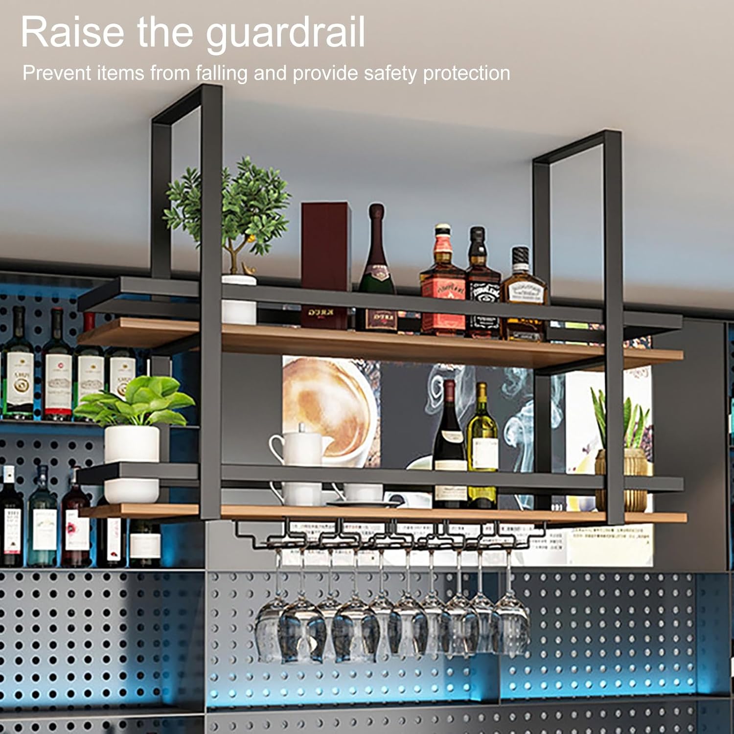 This Industrial Floating Wine Glass Rack combines a sturdy iron construction with a sleek industrial design, making it an ideal choice for enhancing your home or commercial space. Perfect for hanging from the ceiling, it not only saves valuable floor space but also transforms empty wall areas into functional storage solutions. **Why Choose Our Wall-Mounted Metal Wine Rack:** - **Durable Finish:** Treated with high-temperature nano-paint, our rack boasts a glossy surface that resists discoloration, deformation, and rust, ensuring long-lasting beauty and performance. - **Versatile Storage:** The multi-layer design offers plenty of room for wine bottles, spice jars, kitchen utensils, and more, making it a practical addition to any kitchen, bar, or restaurant. - **Easy Maintenance:** Its smooth surface makes cleaning a breeze, allowing you to keep your space looking pristine with minimal effort. **Product Specifins:** - **Name:** Iron Hanger Rack Bar - **Material:** Wrought iron and solid wood multilayer board - **Color:** Black - **Style:** Simple and modern - **Placement:** Hanging - **Furniture Structure:** Frame structure - **Shape:** Rectangular - **Ideal Scenes:** Perfect for areas that need extra storage, such as kitchens, bars, and restaurants. **What‘s Included:** - 1 Iron Hanger Rack Body - Necessary mounting screws and accessories **Installation Tips:** 1. **Choose the Right Lon:** For optimal stability and safety, install the rack on a solid and level ceiling. 2. **Maintenance:** Simply wipe the surface with a dry cloth to keep it looking new. Elevate your space with our Industrial Floating Wine Glass Rack and enjoy a blend of style and functionality that enhances any environment!