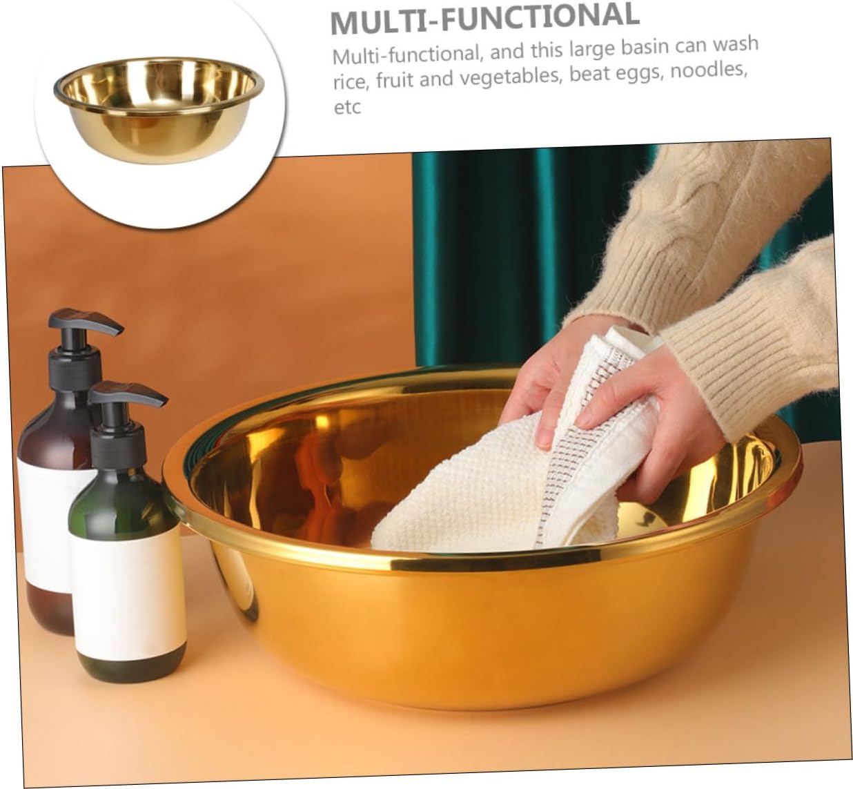 Package Include 1 x Stainless Steel Basin Characteristics -Color:Golden stainless bowl -Material:Stainless Steel large metal mixing bowl -Size:36.00X36.00X12.00cm/14.15X14.15X4.72in kitchen vegetable basin -It's much more convenient than a single bowl or a slotted spoon, and it doesn't take up any more space steel bowls. -Good stainless steel material that is sturdy and . Stainless Steel Basin can be used for a long time stainless steel bowls. -The flat bottom, anti-slip design, which is more stable and to use. Stainless Steel Basin is very useful metal mixing bowls stainless steel. -Multi-functional, and this large basin can wash rice, fruit and vegetables, beat eggs, noodles, etc big mixing bowl. -Large size design, multi-use function, suitable for your different needs, convenient and stainless steel mixing bowl.Goods Informationlarge metal bowl It's much more convenient than a single bowl or a slotted spoon, and it doesn't take up any more space.metal bowls mixing Do you need a Food Basin for using at home? If so, then you can come to see this stainless steel basin, the food basin, is made of stainless steel material, and to use.large stainless steel bowl Not only suitable for home, it also can be used in restaurant