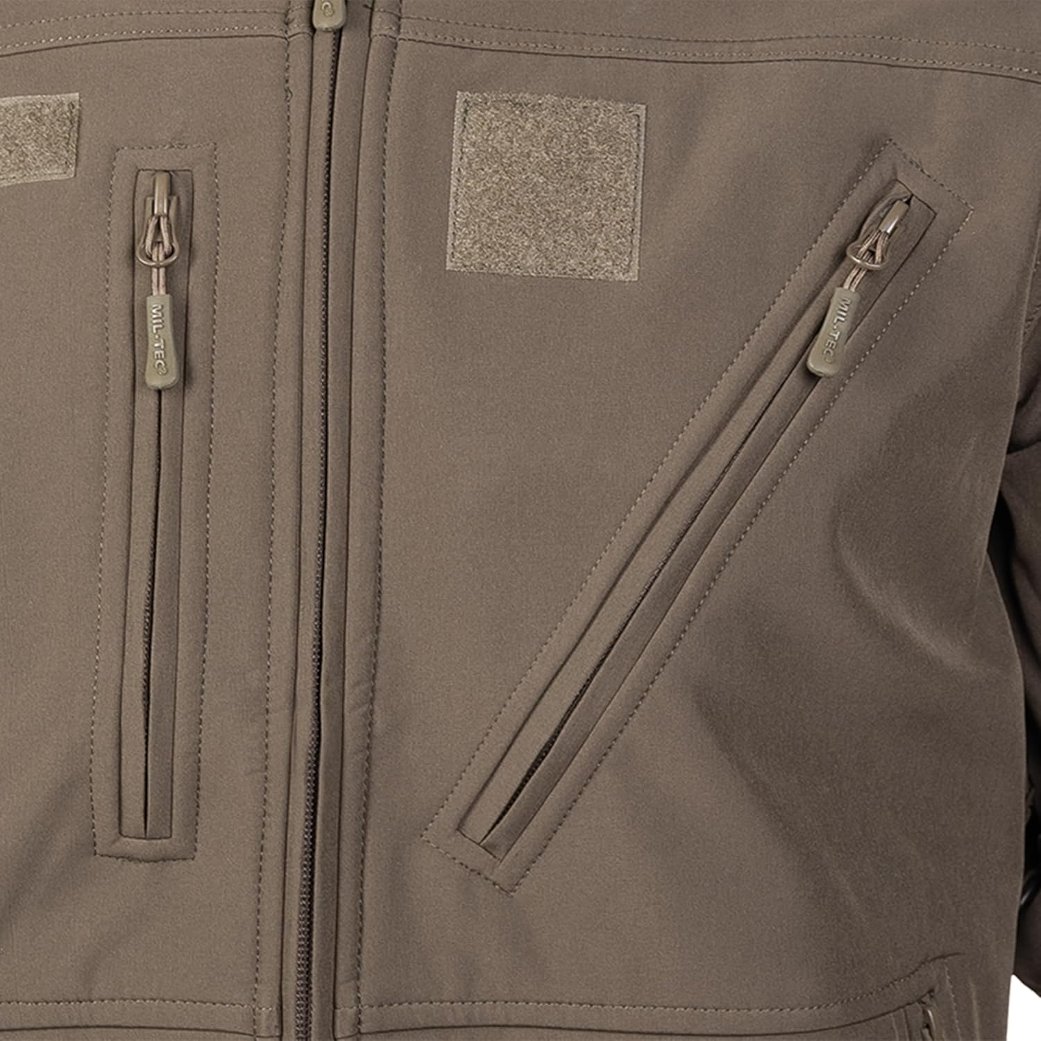 3-layer laminate 1. Layer: 96% polyester, 4% elastane (310 g/m²). Layer: breathable polyester membrane. 3. Layer: 100% polyester (fleece) mesh insert: 100% polyester hydrostatic head: 5,000 mm - various outer pockets with zip - inner pocket with zip - airtight zips on the outside - front zip with stored wind protection - ventilation zip in the armpit area - various Velcro strips for attaching patches or badges - reinforced elbow area - sleeves adjustable by Velcro fastener - adjustable hem. hood in the collar