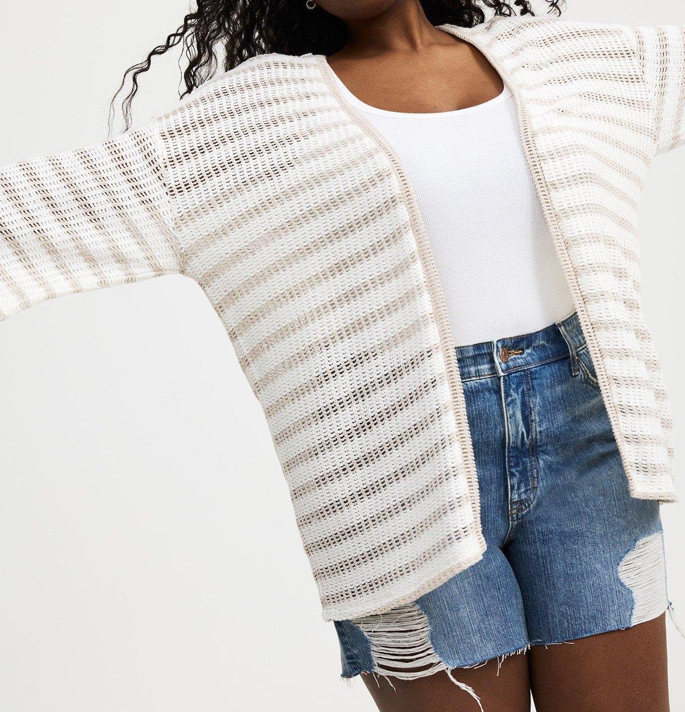 FITModel is 5'10" wearing size 1.Relaxed fit.Kimono style sleeves.Measures 32" from shoulder (size 2),MATERIALS + CAREYarn knit fabric.59% cotton, 40% polyester, 1% spandex.Machine wash cold. Line dry.Imported.DETAILSOpen front.Long sleeves.