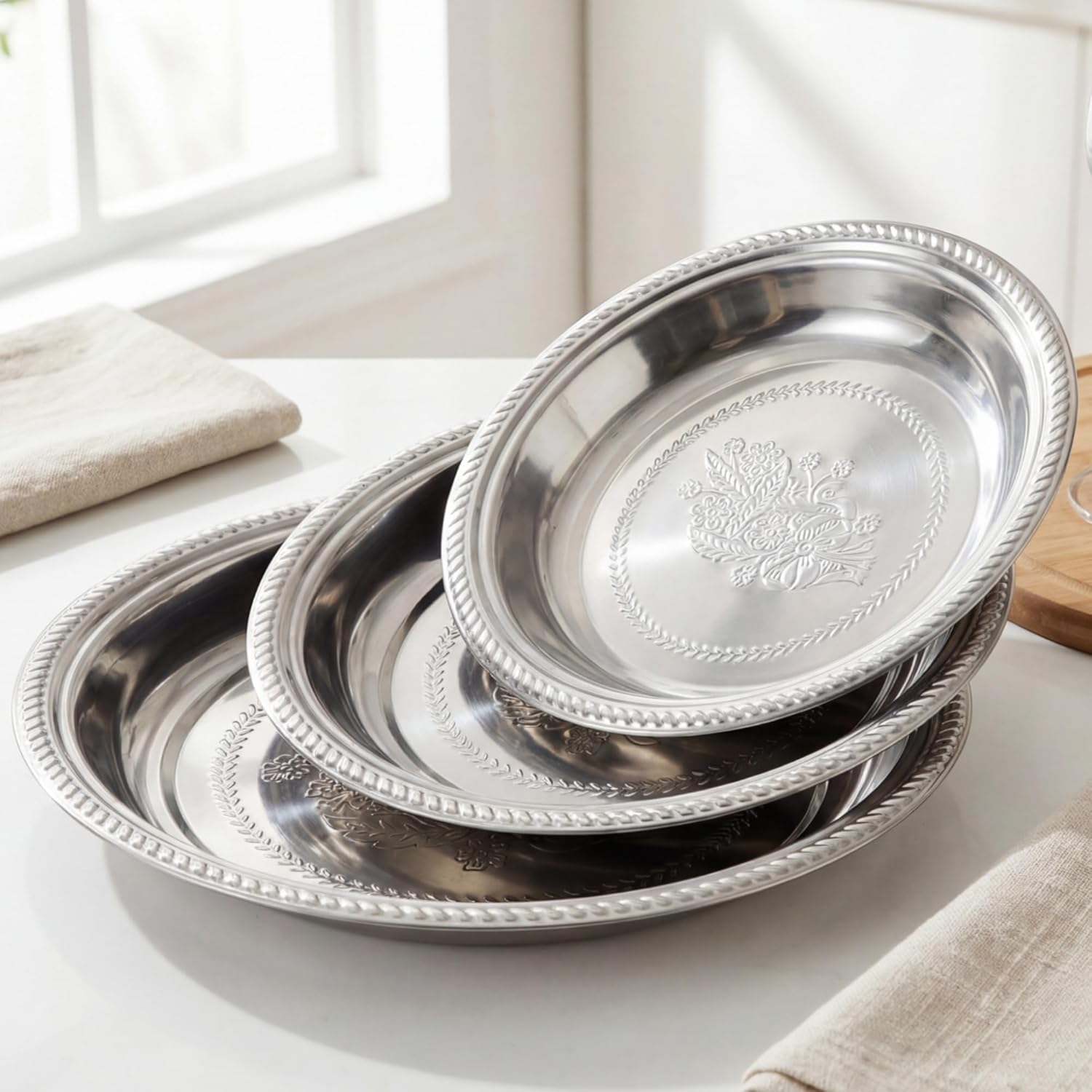 Features: Durable and shock resistant: Made of food grade stainless steel, these metal bar traces offer excellent rust resistance and durability. They are not easily broken, so you don't have to worry about them shattering and injuring you or your family. They are an ideal alternative to fragile ceramic and glass plates. Easy to clean and store: These round dinner plates have smooth, rounded edges with no rough texture. They can be easily hand-washed or dishwasher safe. This makes the entire cleaning process more convenient. Furthermore, they can be stacked to save cabinet space. Specifications: Material: stainless steel Color: silver Size: 15.75", 14.17", 12.6" Package includes: 3 x Silver serving trays Notes: Manual measurement, please allow slight errors on size. The color may exist a slight difference due to different screen displays.