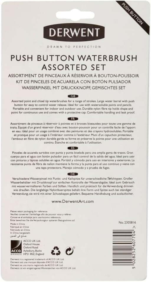 Assorted point and chisel tip waterbrushes for a range of strokes. Large water barrel with push button for easy to control water release. Ideal for use with watersoluble paints and pencils. Portable and convenient for indoor and outdoor use. Durable nylon fibre tip holds shape and point for continuous use and comes with a protective cap. Comfortable handling and leak proof.