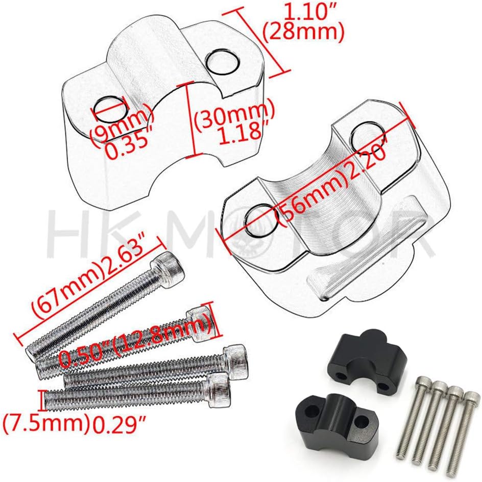 Motorcycle Aluminum Alloy Handlebar Risers Height up AdaptersFeature:Made with high quality Aluminum alloy for maximum durability.High precise CNC machining process, more safe and more reliable.Anti-rust, wear resistant and anti-corrosion, long service life.Easy to install and use, saving place.After installation, the motorcycle looks more stylish and you will have more comfortable riding experience.Specification:Condition: 100% Brand NewMaterial: CNC 6061-T6 Aluminum AlloyColor: black/silverSize: Riser 30mm/1.18 inch(refer to Picture size)Handlebar hole diameter: 22mm (7/8")Fitment: For Bimmer G310R 2017-2018For Bimmer G310GS 2017-2018