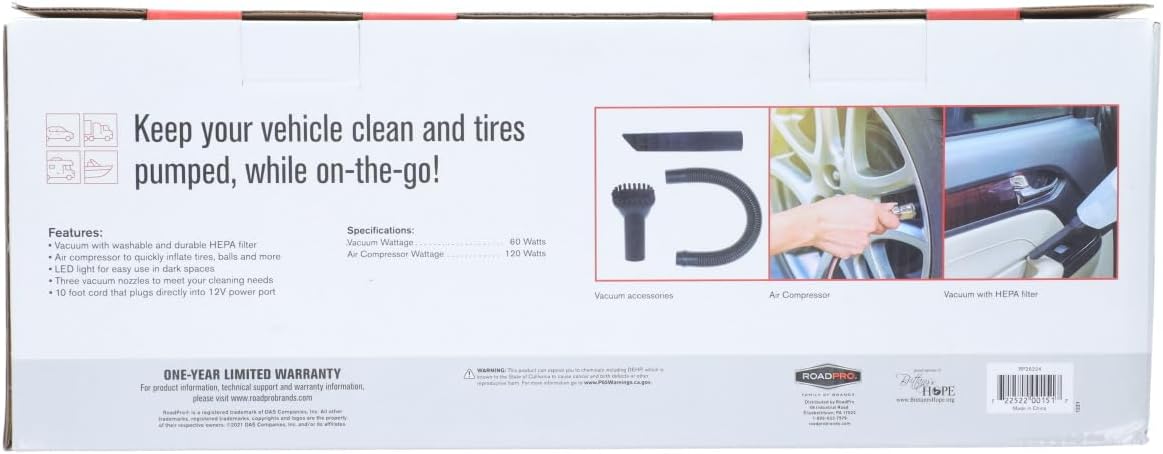 This car vacuum with tire inflator and light is a must-have for campers and truckers or anyone with an on-the-go lifestyle. Plug this handy travel tool into your 12-Volt outlet and choose between the 12-volt vacuum or air compressor function. The car vacuum cleaner features three different nozzles and a HEPA filter to get rid of crumbs and dirt inside your vehicle without dust recirculating into the air. The RoadPro portable tire compressor with air pressure gauge includes a 2.5 foot air hose to inflate tires or balls and other items. The LED light makes it easy to use either 12 volt function at night or in darkness.